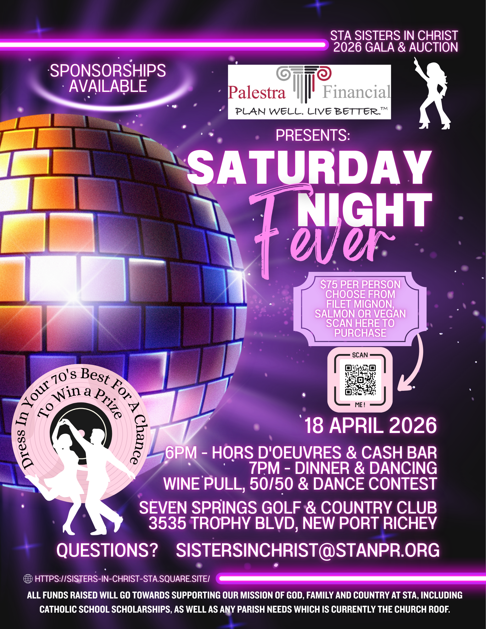 ALL FUNDS RAISED WILL GO TOWARDS OUR MISSION OF GOD, FAMILY AND COUNTRY AT STA, INCLUDING CATHOLIC SCHOOL SCHOLARSHIPS, AS WELL AS ANY PARISH NEEDS WHICH IS CURRENTLY THE CHURCH ROOF.
